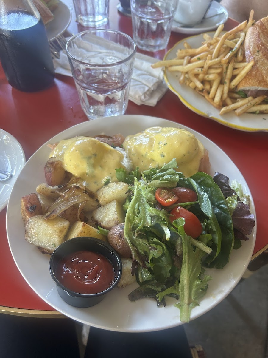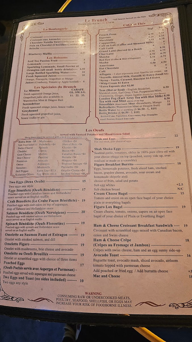- Oeufs Benedicte: Perfectly poached eggs atop Canadian bacon and an English muffin, drenched in velvety Hollandaise sauce, are a breakfast lover’s dream come true at just $11.00.