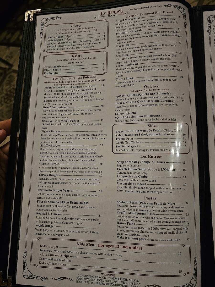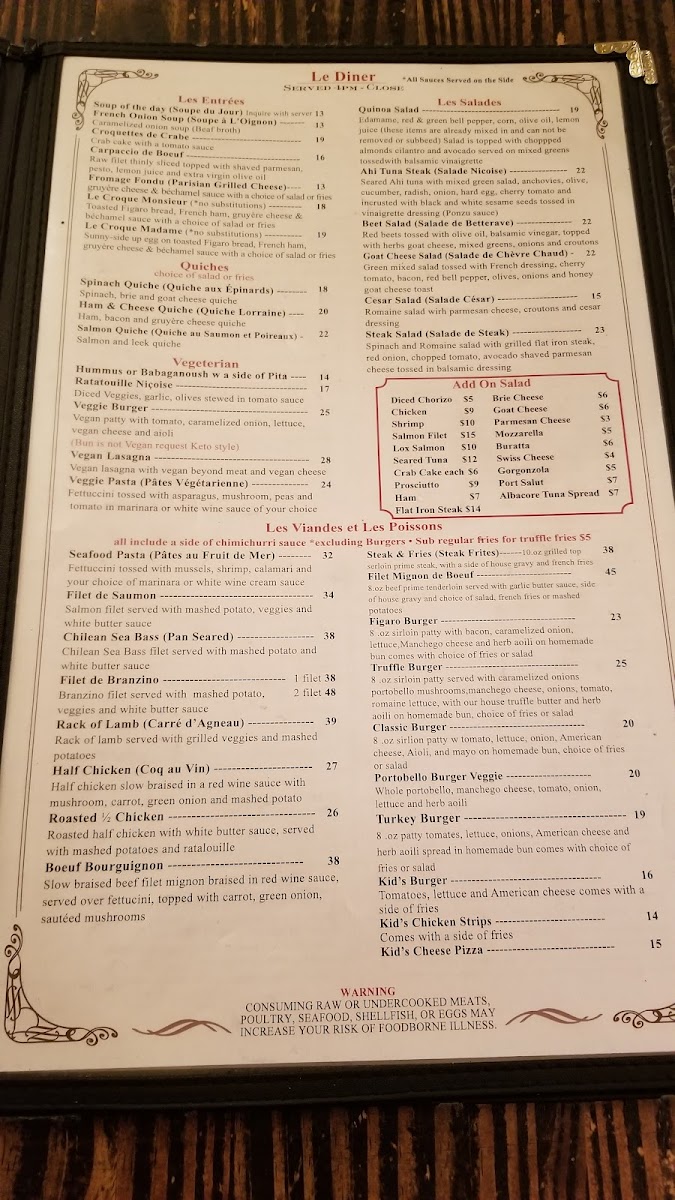Customer reviews echo the charm of Figaro Bistrot, with one visitor, Kinsey Dulcet, raving about the friendly staff's genuine concern for creating a beautiful dining experience. Another patron, Seung Jung, shared their love for the French onion soup, a rich classic that showcases the restaurant's commitment to comfort and flavor. On a recent visit, Danny Fenty found their beef bourguignon “tender and delicious,” reaffirming the bistro's knack for delicious entrees paired with an ambiance that rivals that of a Parisian cafe.